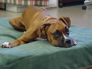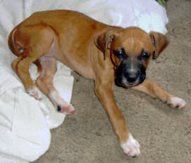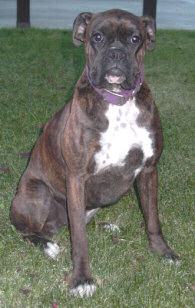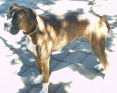 Placed... 7.26.2006...Bend. Zeeba is a female fawn brindle (moderately flashy) 16 mo. old boxer, approx. 45# and has a docked tail and natural ears, spayed, vax'd She is a very sweet girl and is good with other dogs---male or female, and children, but typical of the breed, would like to chase cats.(This is common for boxers and can be eliminated with training.) Her training has been very limited, but she is a very quick learner and is quiet and good in a crate. She is very high energy and would make someone a super running partner. She is shy around new people (especially men) but soon warms up and is learning to love affection. Marnie.. 541 385-9110 in the evenings (work), or at dogtec@yahoo.com