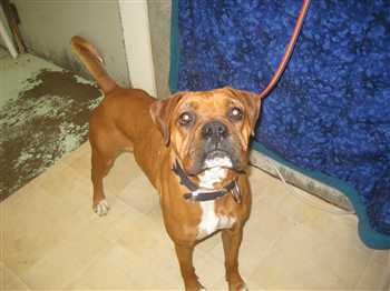Sam is a 17 month old red fawn, neutered boxer male. He weighs 71# of average boxer size. He is a sweet guy. At first assessment he does not seem to be a dog that jumps up on people. He is not a hyper dog. He knows sit and seems cooperative around the house. When walking on leash he seems to be reserved, and with out meeting other dogs he doesn't pull. He really wants a family of his own. He has had all his shots, worming and has been well taken care of. He sleeps quietly in a crate. He is the most attractive boxer I have ever rescued. He isn't aggressive around my dogs. It is unknown how he is with cats and children but he is very mild mannered. He doesn't seem aggressive at all but was allowed to run and was chasing livestock.