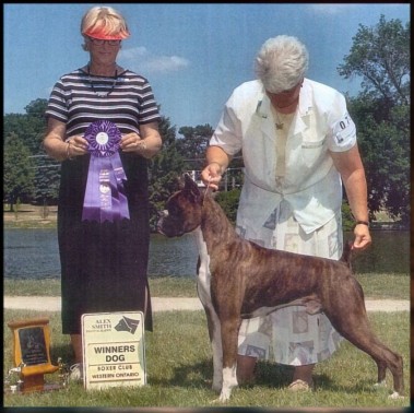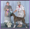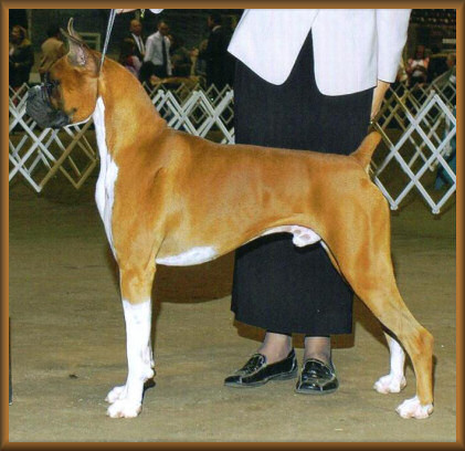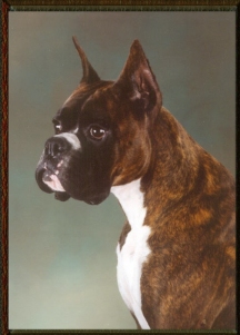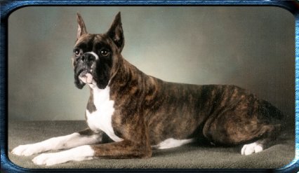 He is a tall, dark brindle with a great topline and excellent tail set.