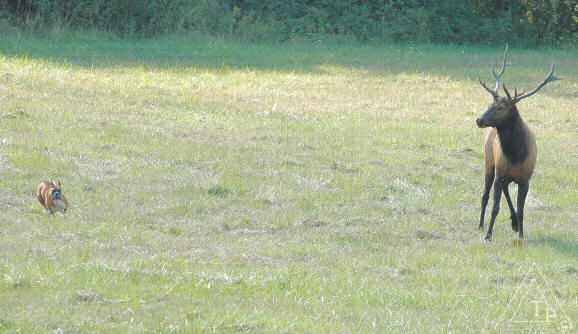 Moochie was supposed to be in the North pasture. I saw the Elk in the South and thought I would shoot some pics. None of the other dogs in the North new the Elk herd was out there. Even the boxers in the fenced compound didn't know. Fortunately Moochie broke off when I told her to.