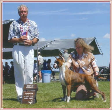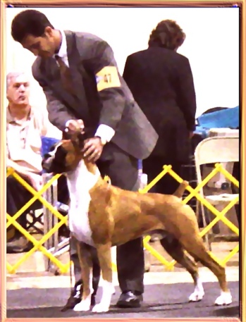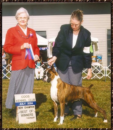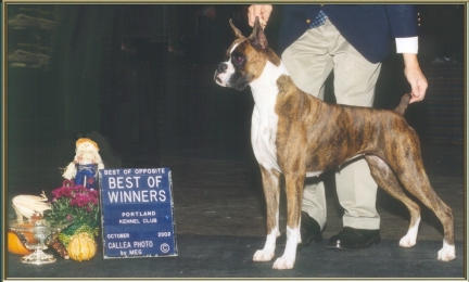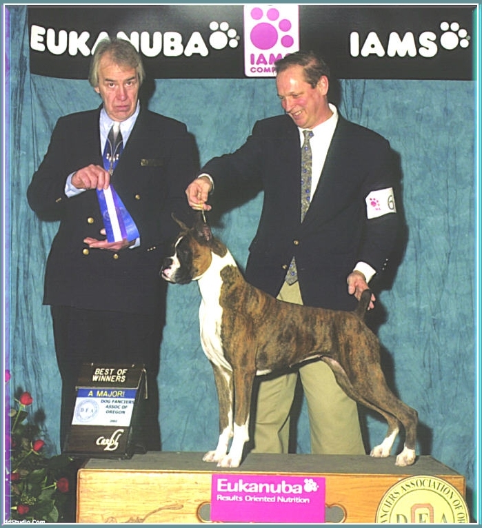 Gwena is shown above with me winning her first points Best of Winners and Best of Opposite Sex. Recently she was shown by good friend Dan Dickinson. They made a great team (Gwena, Dan with wife Lynn orchestrating)and capturing a huge major at the Rose City Cluster 2002. On July 4 Gwena was Winners Bitch and Best of Winners and finished her championship with me handling. A huge thank you to Tom and Charlene for all their help in Gwena's win and much more.