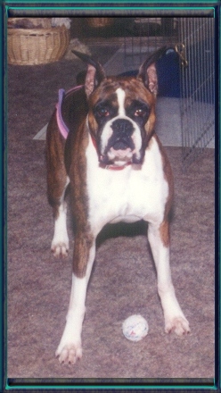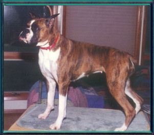 Cosmo is the subject of the overlay above. He and I spent six years going to shows trying to finish his championship. He gained most of his points in the first two years but the major win he needed to finish just kept alluding us. It wasn't his fault. As you can see above he is very correct, to the standard the way the American Boxer Club has written it. His inability to get the last win, to finish his championship,was more a product of timing, finances and geography. The link below goes to the story of his hijinx in the ring and some candid shots of Cos and I at his last show.