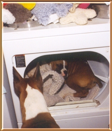 Above Lola stays busy finding new and interesting things to do. Here she is hiding in the dryer. She wanted to be where the food was prepared but her mother, Punk, had first dibs. So Lola, being an intelligent boxer girl, figured out a safe place to observe.