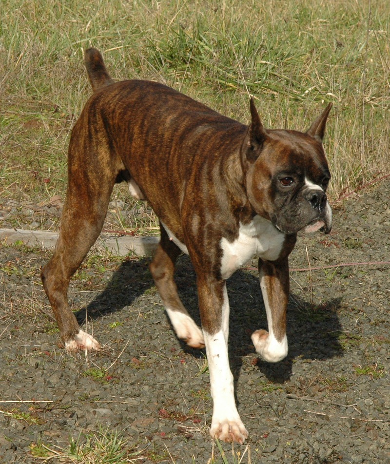He is a tall, dark brindle with a great topline and excellent tail set.